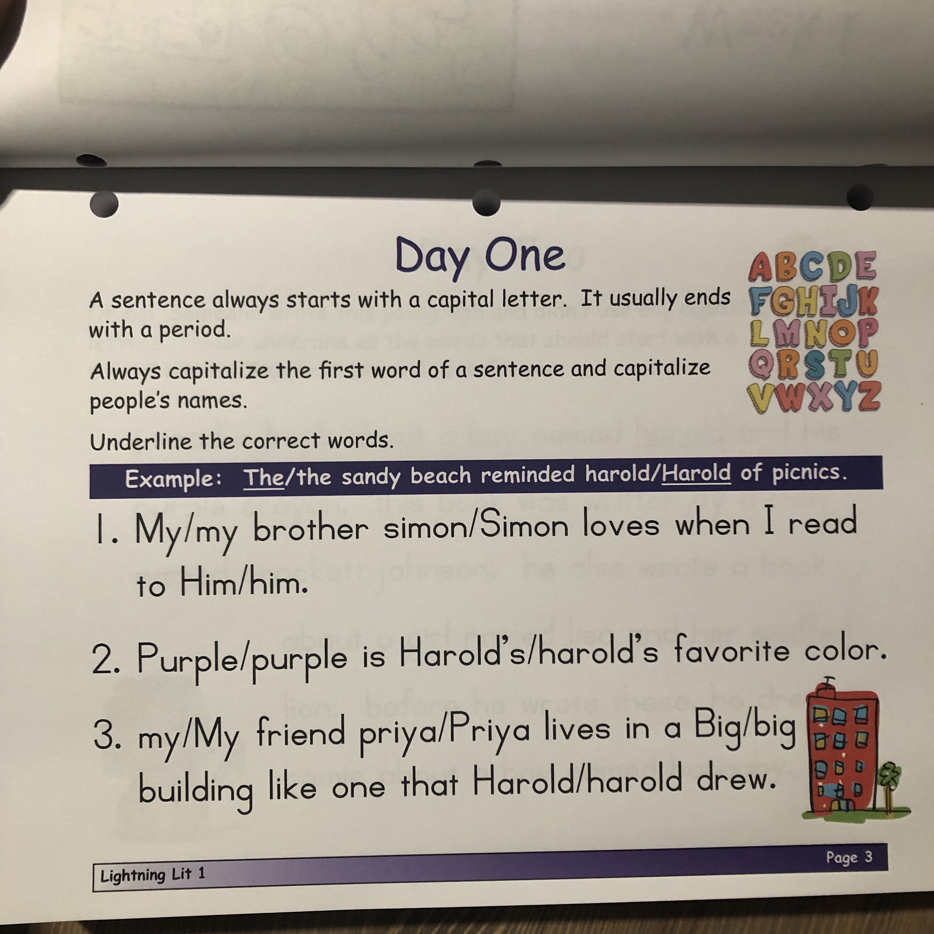 You are given in the Teacher’s Guide the highlights of the lesson, talking points, and ways to extend and deepen the lesson. It’s quick reading – just take a look at it on a Sunday evening and you’re covered for the entire week. On your first day of class, have your student read the story and any accompanying pieces (for us it was Aesop’s Fables) and dive into their Workbook. Our very first week with Harold and the Purple Crayon covered Sentence structure, Inference, composition of their own story from a picture, parts of a story, narration, optional dictionary pages, and journaling!