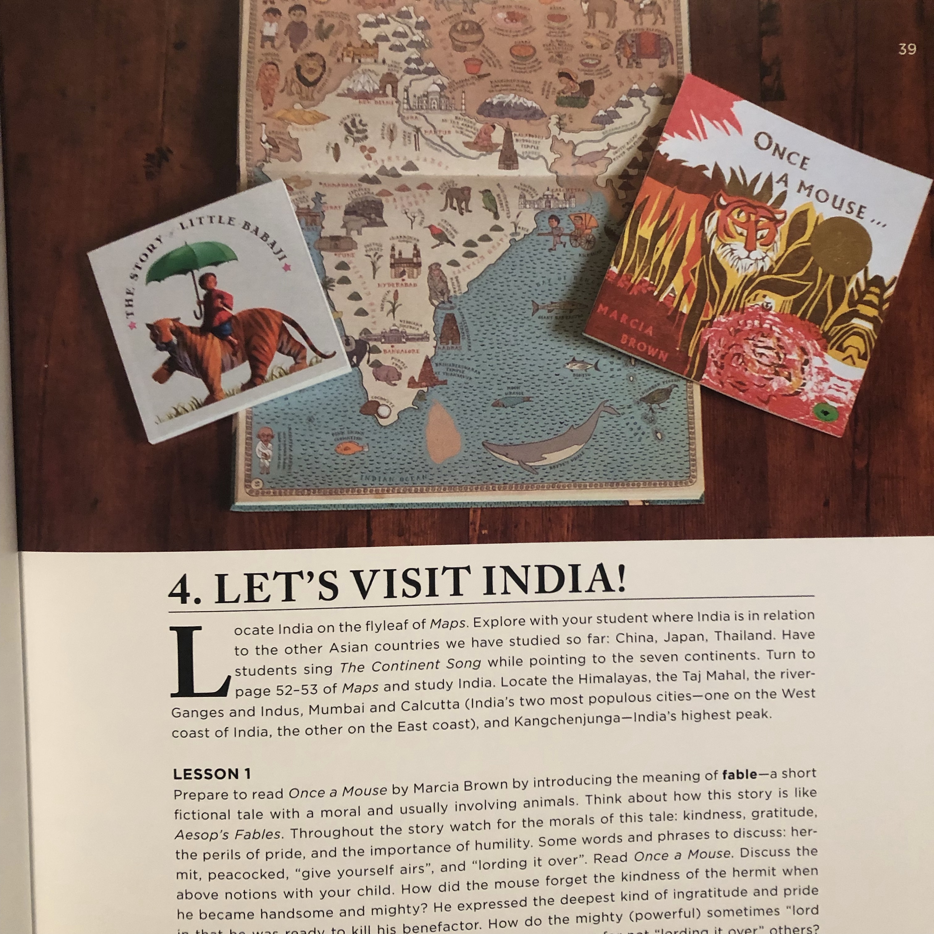 Everything you need for an entire Semester (4 lessons per week) or year (3 lessons per week) of study is included. You get a selection of carefully curated books featuring diverse authors and viewpoints, A complete, full color Guide to follow with additional images to use in the back, and an elegant notebook. The Charlotte Mason approach uses Notebooking to solidify the learning visually and kinesthetically. The student can color, cut, and paste the images from their Guide to collect their thoughts and in this unit, create a travel journal of their lessons. This curriculum covers parts of Asia, Africa, Australia, and even Antarctica, by touching on stories and activities from each part of the world. You can follow the lessons linearly as written, or pick and choose the order of your study. We have covered 6 weeks of lessons so far, and made sure to cover China to accompany another book we were reading outside the curriculum and to cover India, for the celebration of Diwali. Geography is a major part of the curriculum, but we loved the cultural studies, art, ELA, history, and the reading. Don’t expect to cover just one subject.