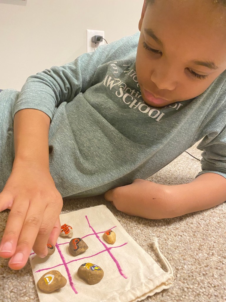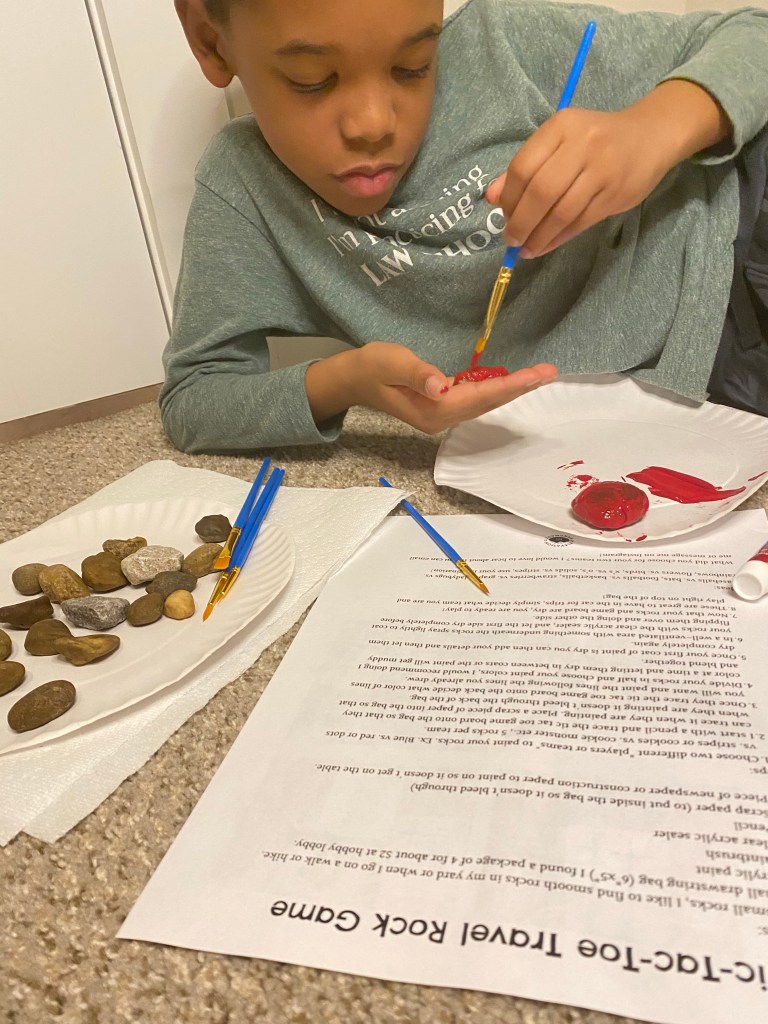 After collecting rocks (and shells, and clover), we headed inside to really get to work. Cash customized multiple sets of rocks to use as game pieces, using paint and brushes, then after they dried covered them with a clear gloss sealer. He even made his own carrying bag for the pieces that served as the game board. He was able to do all of this by following the downloaded instructions he printed out. I can only imagine that he would have had more fun if his Daddy wasn’t standing over him critiquing his painting skills…