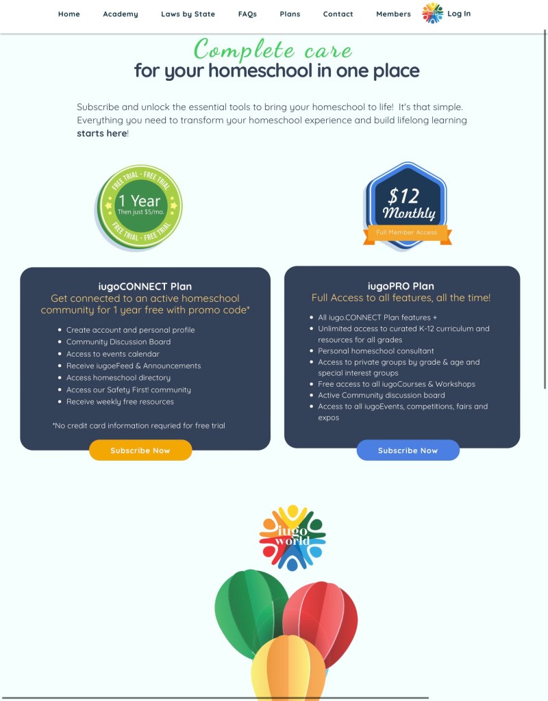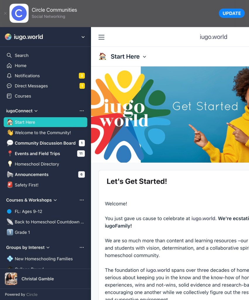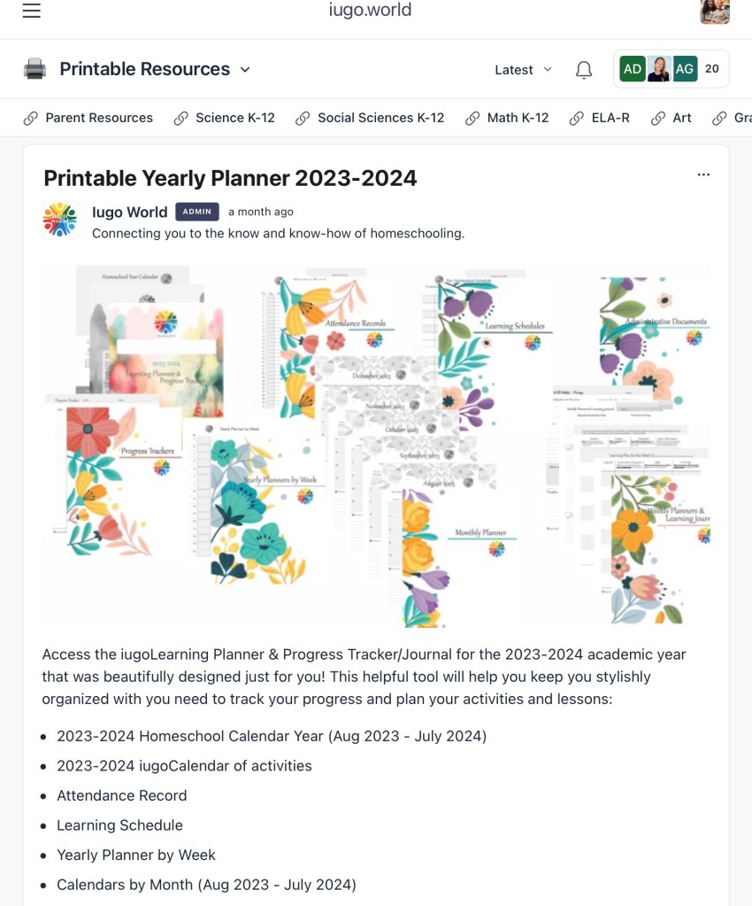 I see so much use and potential in iugo.world already and the site just opened at the end of August 2023. Since becoming a member I’ve already used it to research up to date information on Gifted Learning, voice my opinions in community chat groups, sign my child up for live Spanish lessons, print quick but useful hands-on resources for lesson supplements, and check out standards for guidance on 4th grade learning. The app is already downloaded on both my phone and tablet and I’ve got the site saved on my computer. Even though I homeschool in a state that does not need a cover or requires reporting, I’m also considering the $50 yearly fee for the umbrella school to handle report cards and transcripts, which could come in handy if my son decides to homeschool into high school to circumvent any stress that comes along with records needed for dual enrollment, scholarships, college admissions, or graduation.