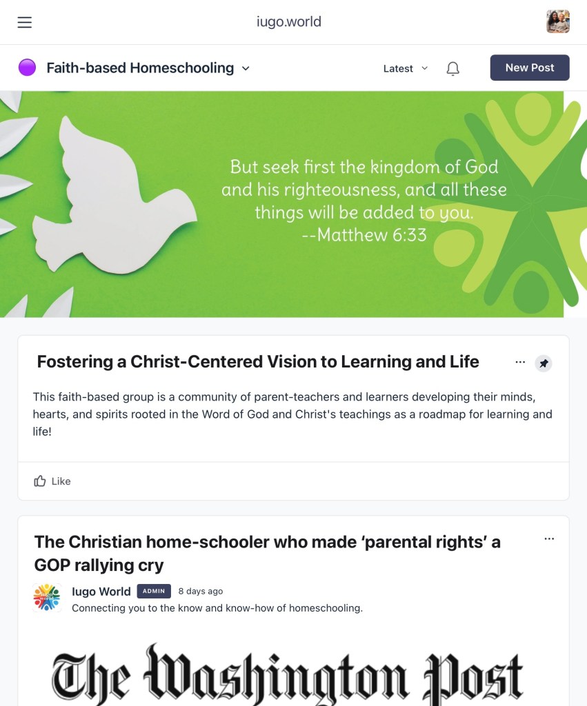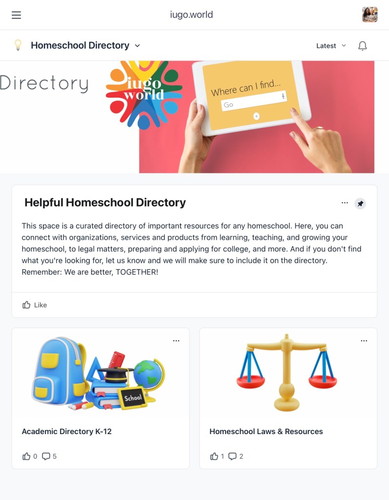 iugo.world is a collaboration between its users and the company. If you can’t find what you’re looking for, you only need to ask for it. You’re witnessing the beginning of something new that will lessen the need for social media chat groups with more opinions than vetted information. I was impressed with sections on the platform for local events, field trips, competitions and fairs and other options to bring homeschools together worldwide.