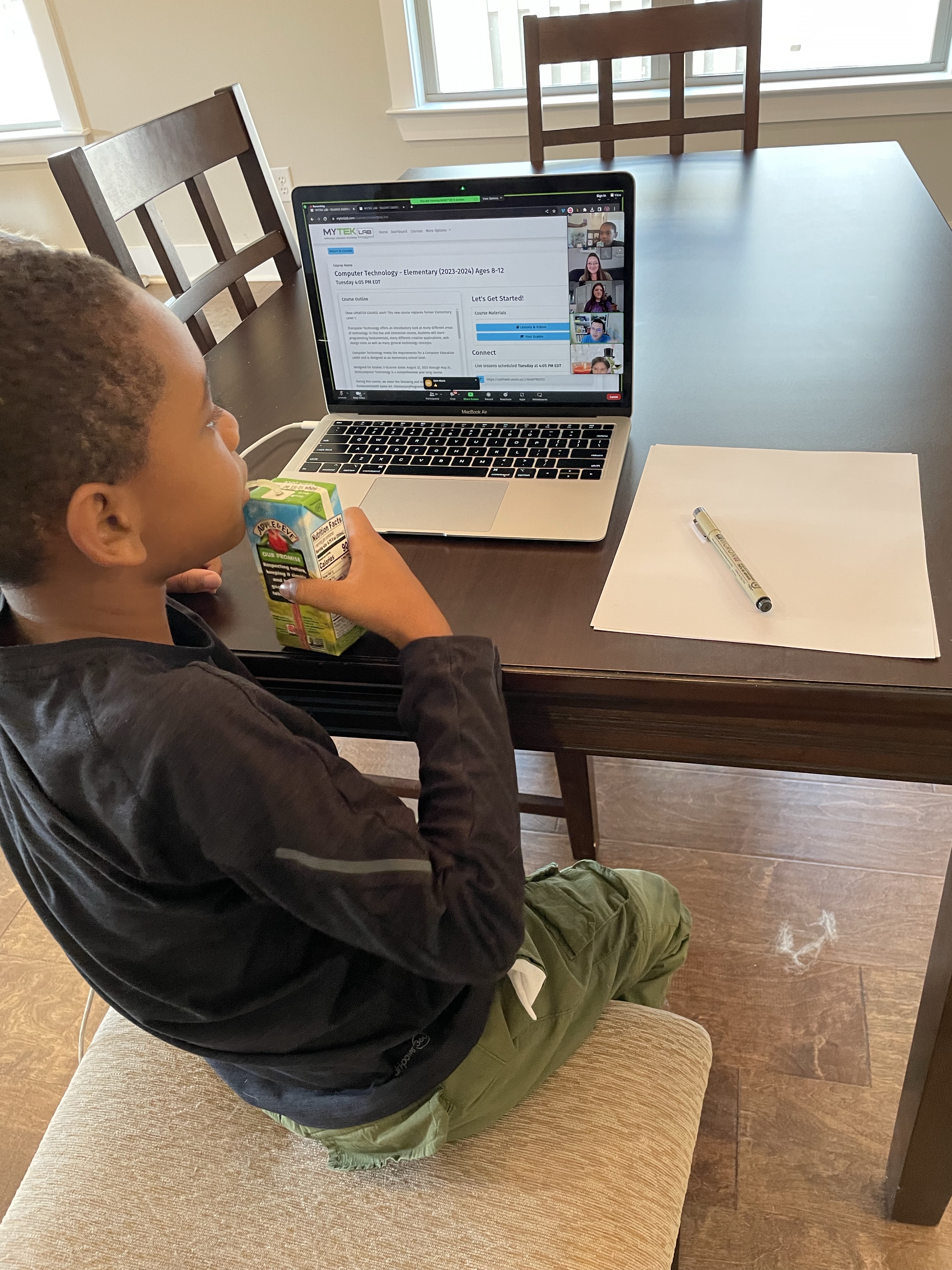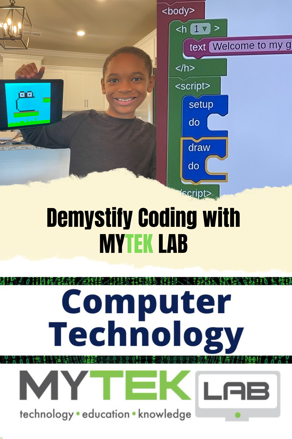 My son, Cash, is taking Computer Technology 1 – Elementary with MYTEK LAB. It’s geared to their youngest students who range between ages 8 – 12, and focuses on introducing a little of everything surrounding technology. It’s a year long course, ending in May, and is constructed with the beginner in mind with no prerequisites needed. In Cash’s very first class, he was able to create his very own avatar to use on the MYTEK LAB dashboard and learned the background of the pixel. By the next class, he had begun coding his very own video game using programming logic and language.