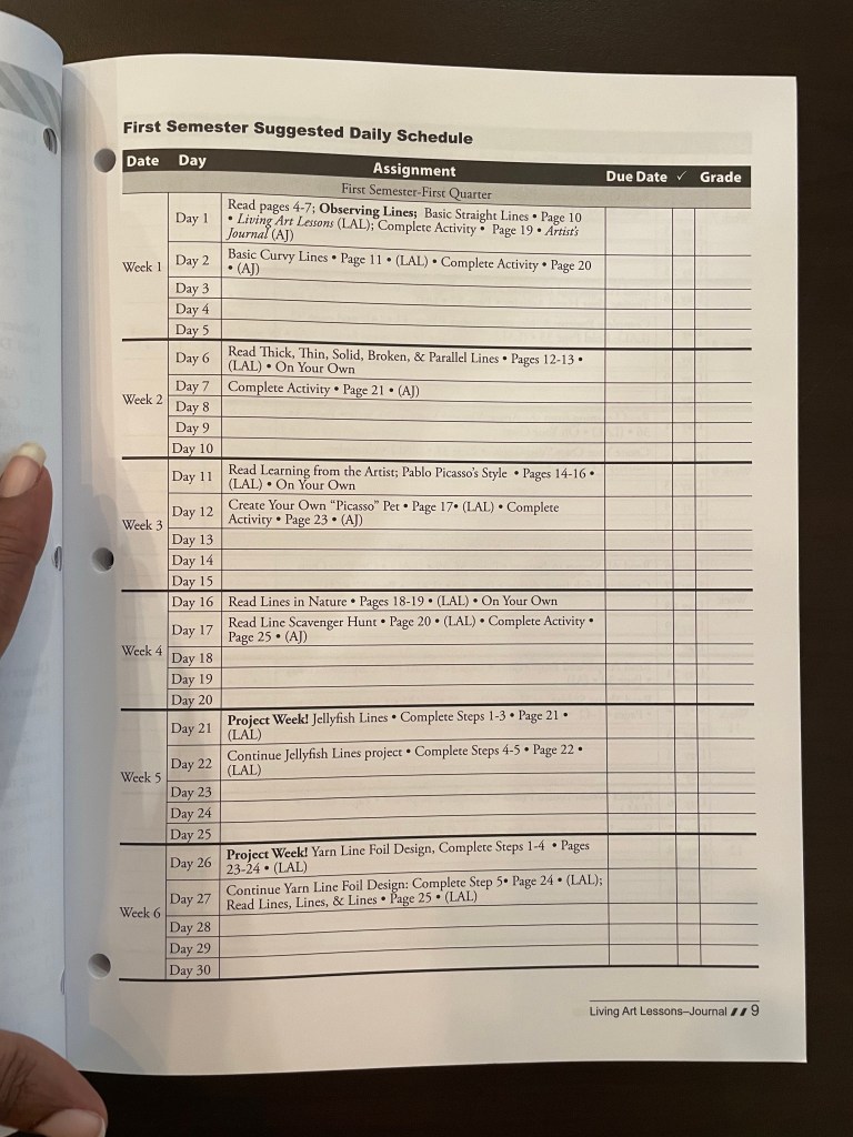 Perfect for students in grades 4-6, Living Art Lessons by Master Books, is broken into 36 weeks of art lessons done twice a week. This is an easy to implement curriculum and each lesson on,y takes 30-45 minutes. Other than gathering supplies, it’s low prep with everything you need for instruction included in Text and the Artist’s Journal. You’ll find an outline of the weekly schedule at the front of the Artist’s Journal as well as space to check off completed assignments, fill in dates, and add in grades.