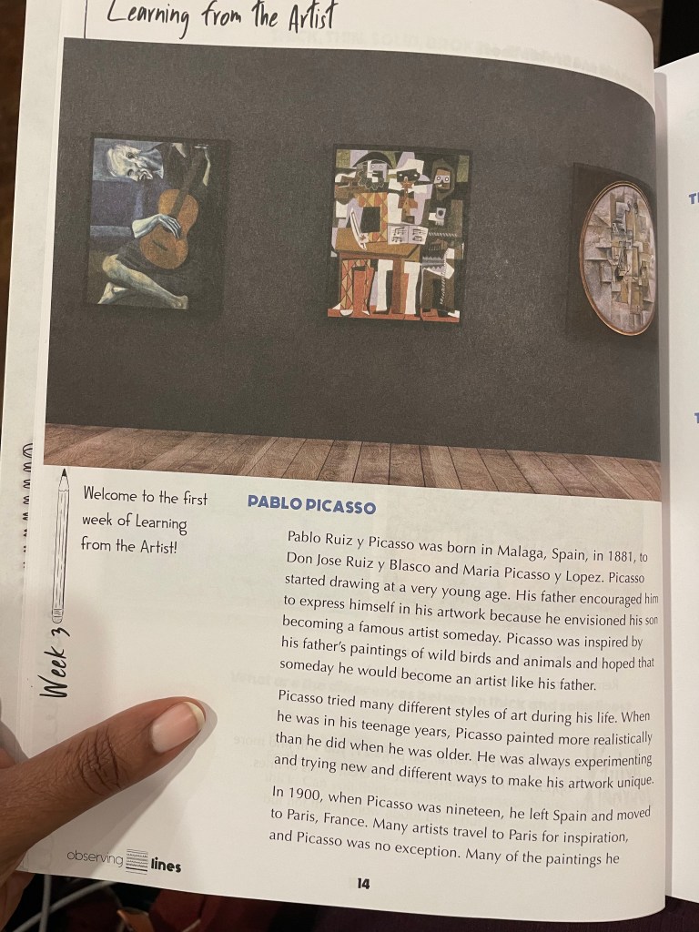 Despite everything I’ve listed, I can not neglect to mention the Activity Pages in the Artist’s Journal. It gives your student a chance to practice foundational art skills to accompany their lessons. Have multiple students, or want more pages to practice? The pages are reproducible and the both books come binder ready. THIS is the way an art curriculum is supposed to work and we’re really enjoying it.