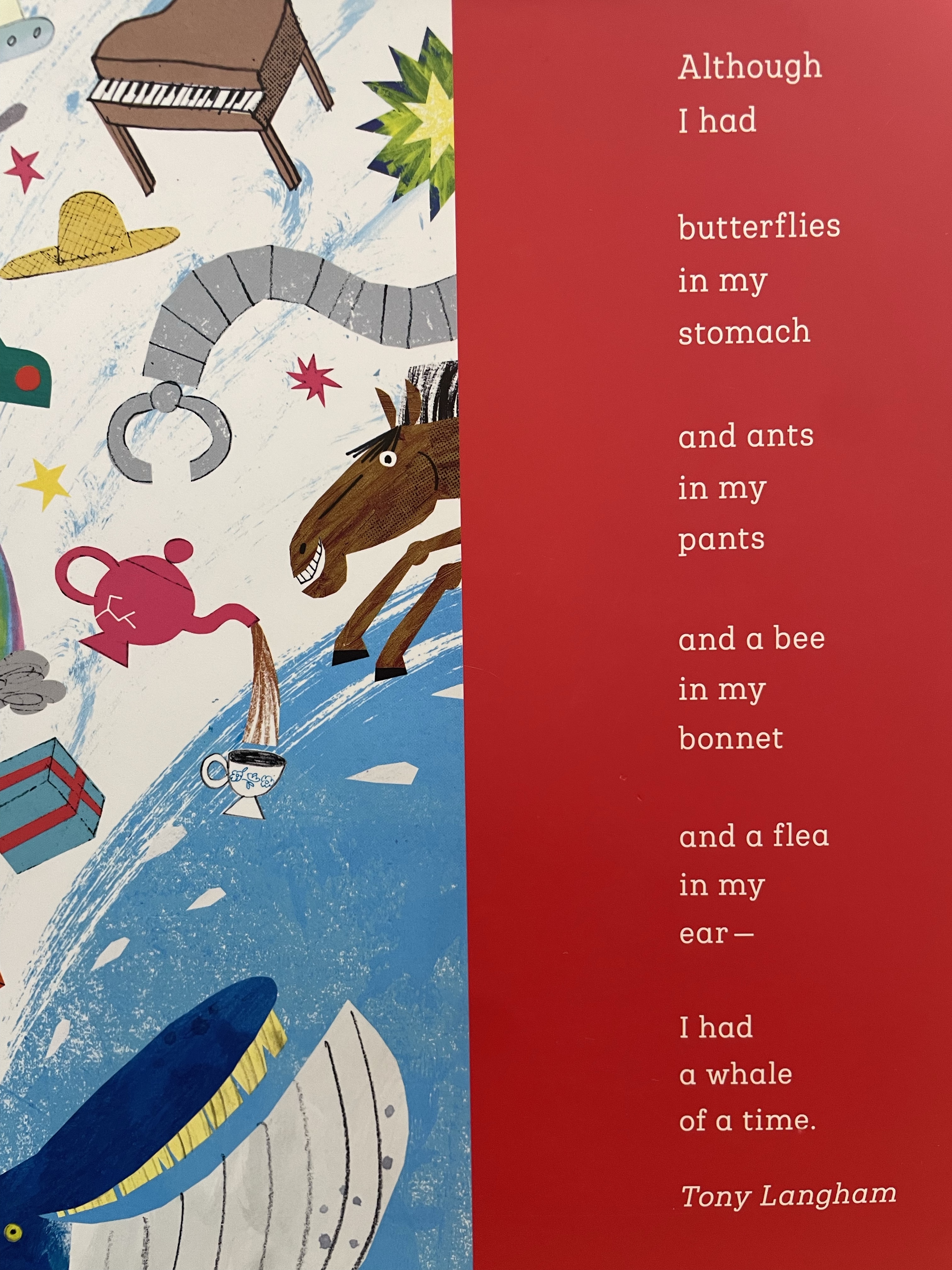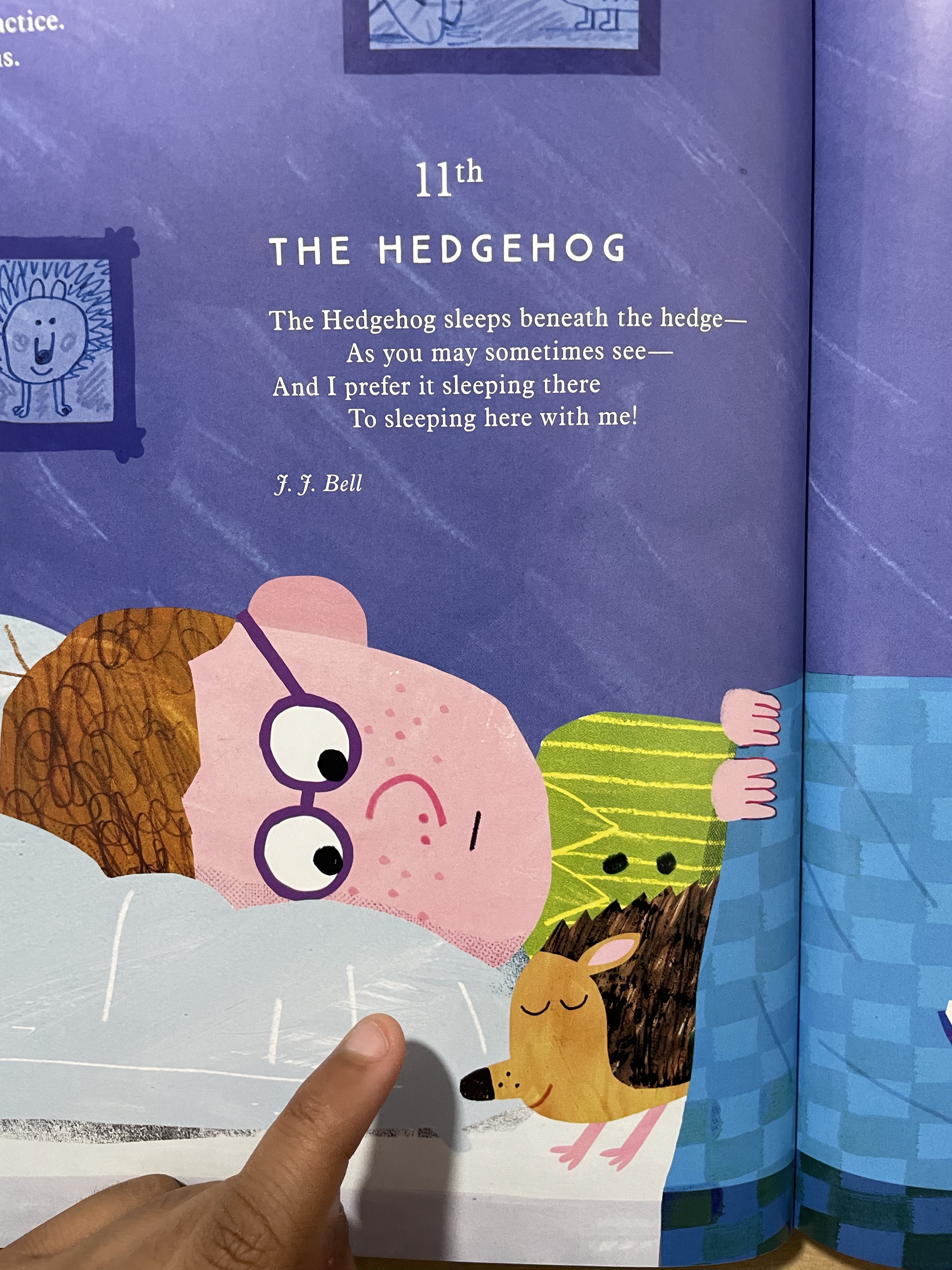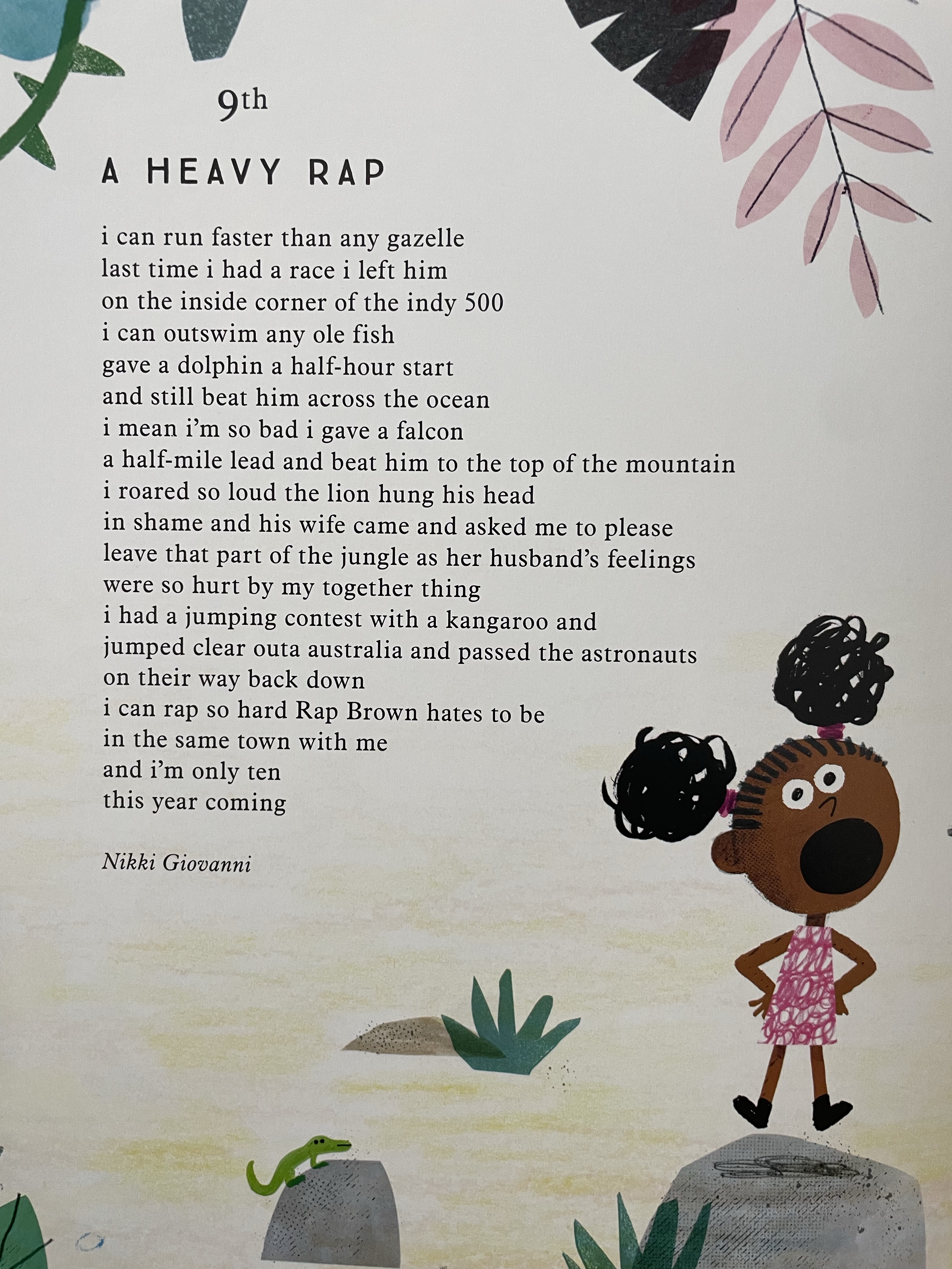 Cash and I started reading in the middle of the book to catch up with the current date. There is a poem a day, often grouped by theme or poetry style but all silly and intriguing. We both laughed audibly but still made sure to examine the deeper intricacies of the writing. You’ll find work from everyone in here – Nikki Giovanni to Robert Louis Stevenson as well as pieces most people learn in their childhood like, “Do Your Ears Hang Low”.