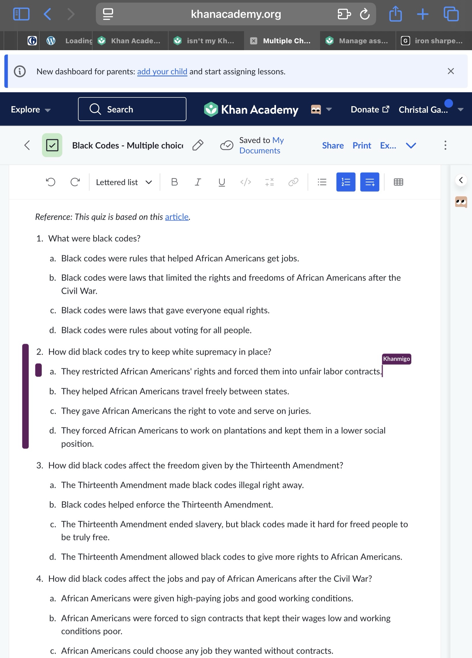 Need a quiz for what your student has been learning? Khanmigo can generate one instantly. Want to gamify review? Create a Blooket or try the quiz generator. Parents can even get recommended assignments based on current progress.