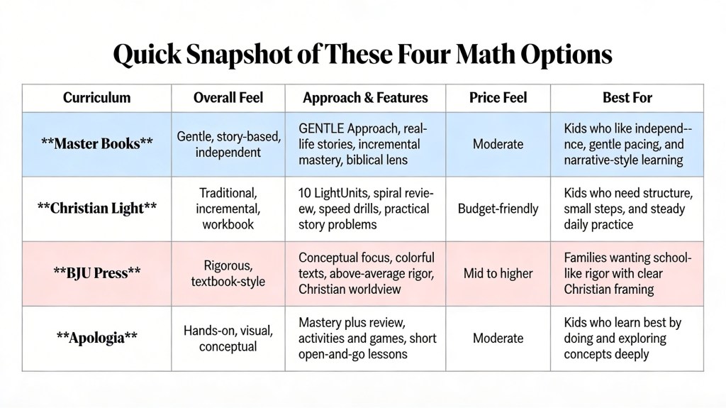 Below are our family’s top four Christian homeschool math curriculums for K–8, with Master Books standing out as our clear favorite.